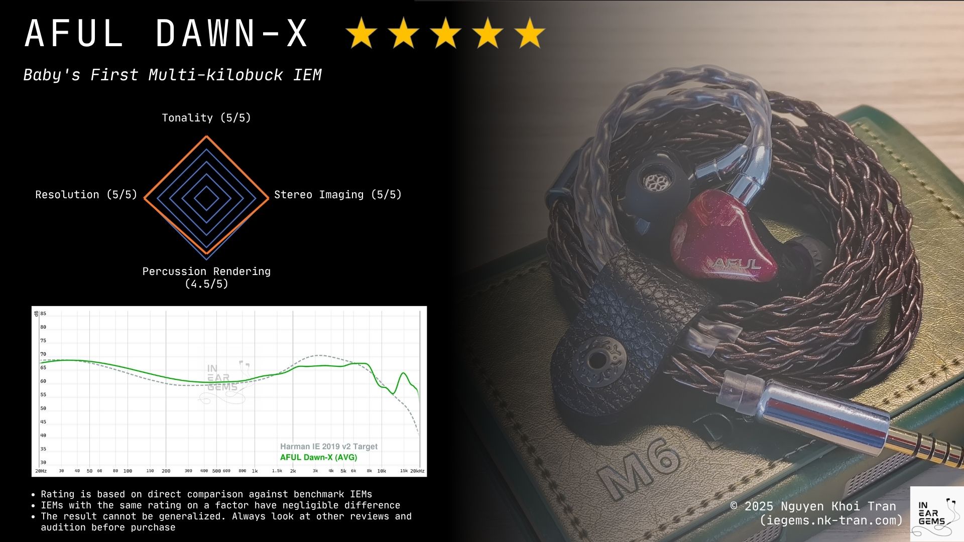 In my personal ranking, which emphasizes more on the sense of rhythm and quality of bass note, I would give DawnX a 4.5/5. I took 0.5 off the score because I think AFUL could have pushed this bass a few dB higher to really show case its quality.
