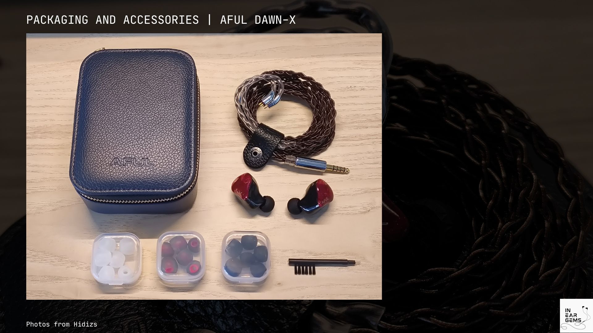 The packaging includes the IEM itself, an 8-wire cable, 4 types of ear tips, a faux leather carrying case, a cleaning brush, and paper work.