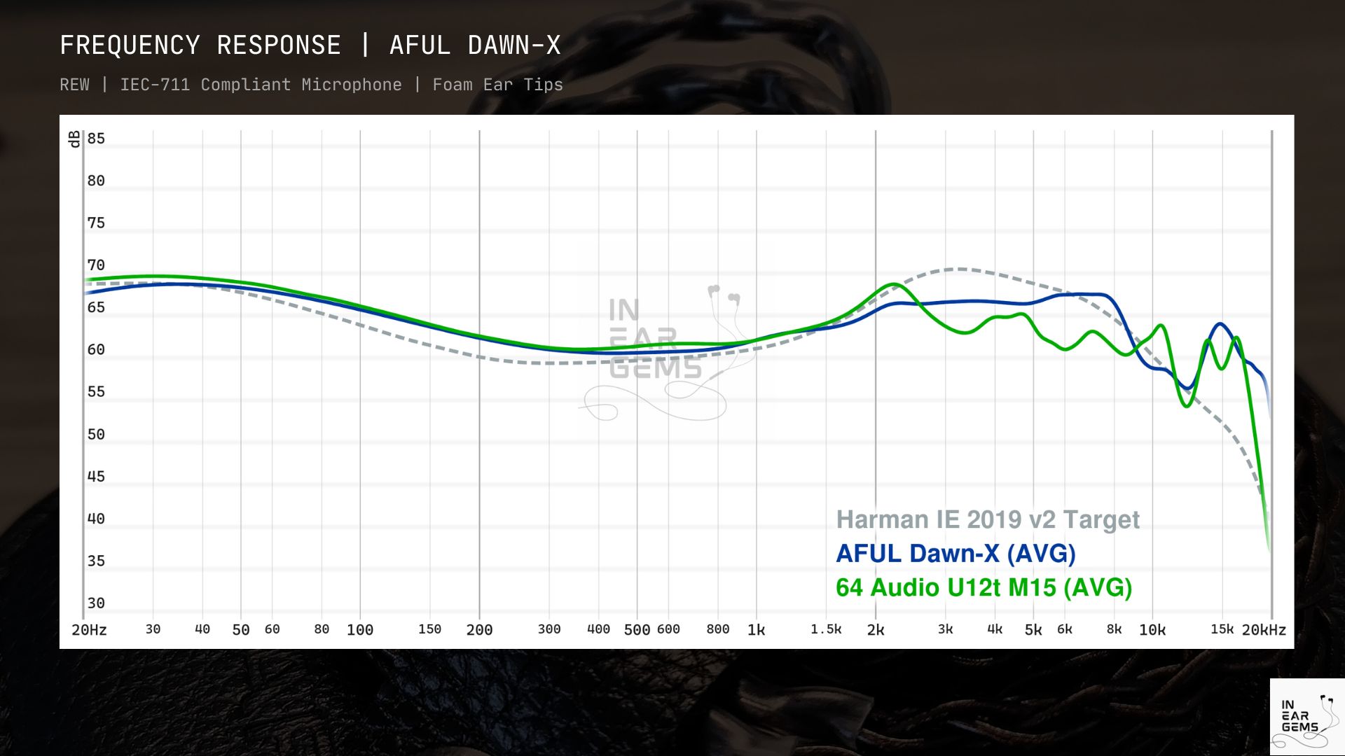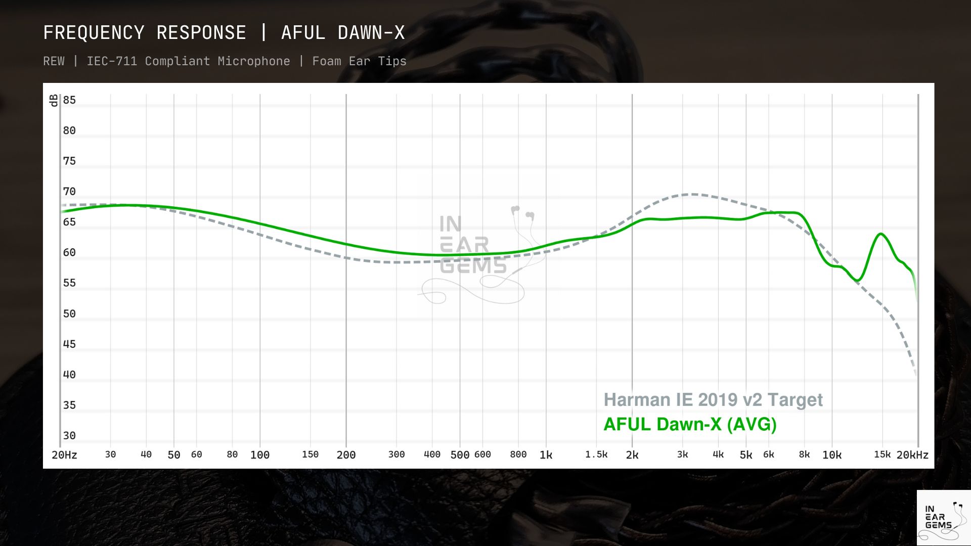 The tonality of the DawnX is exactly what you’d expect from an AFUL IEM: forward midrange that keeps voices from being buried in the mix unless it’s the artist’s design. The midrange tuning is balanced and natural, with a slight warmth that comes from around 1.5dB lift in the lower midrange around 250Hz and a more reserved ear-gain boost topping at around 6dB. This creates a cozy, comfortable listening experience without significant coloration.