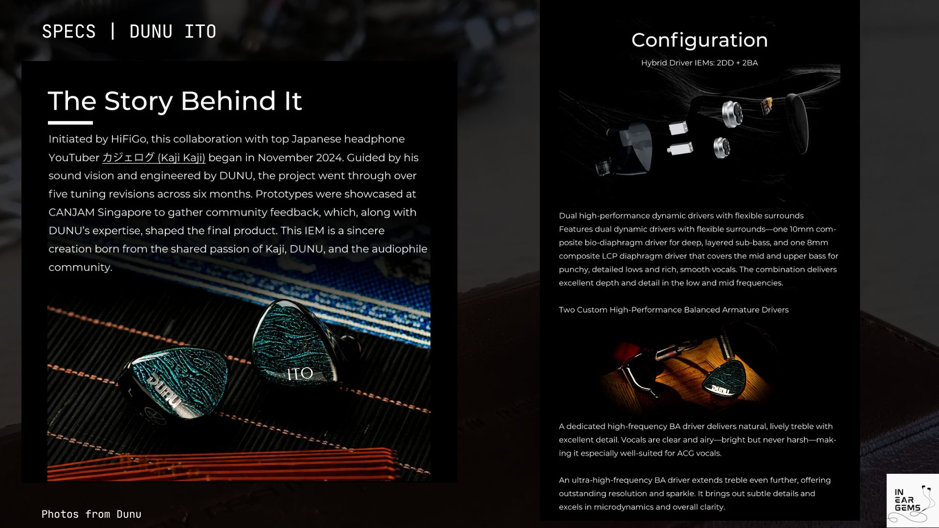 The Dunu ITO was designed in collaboration with Kaji Kaji, a famous Japanese headphone reviewer. The IEM underwent five tuning revisions across six months with feedback from audiophiles at Canjam Singapore, resulting in its final tuning that aims for a bold, full-bodied sound signature optimized for rhythm-driven genres like Rock, Hip-Hop, and Electronic.